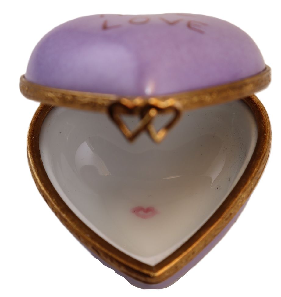 Caja coleccionable de Limoges de Artoria: pintada a mano, numerada y firmada por el artista. Fabricada en Limoges, Francia. Esta auténtica caja de Limoges pintada a mano pertenece a nuestra colección ROMANCE y mide aproximadamente 1,5 x 1,5 pulgadas. Forma parte de una serie limitada de 1000 piezas. En el interior hay un dibujo de unos labios.