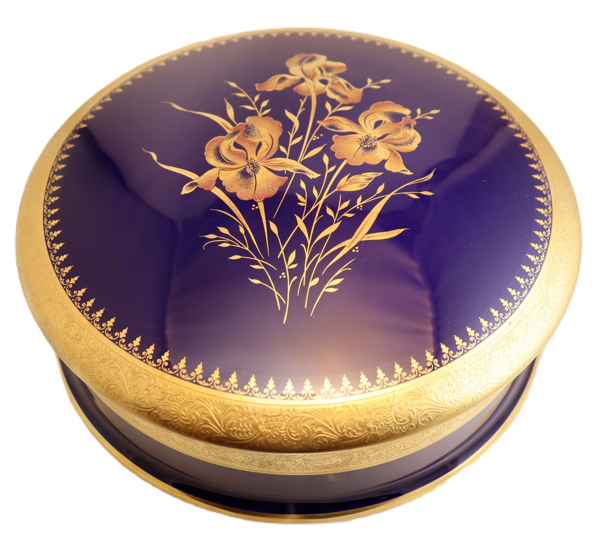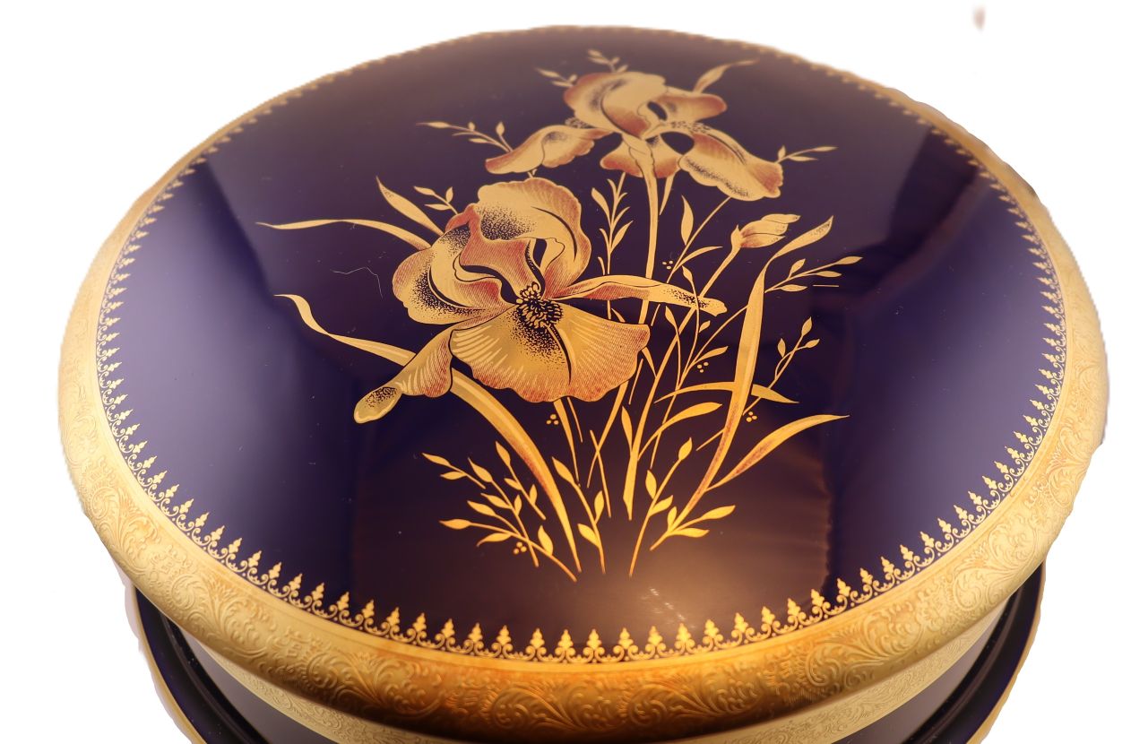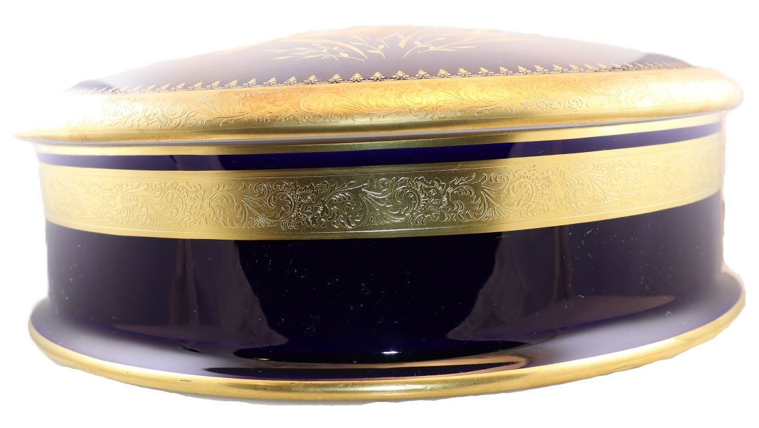 SKU# F15-GOLD-INCRUST Very Large Bleu de Four (Cobalt Blue) Round Box with Real Gold Incrustation with agate polishing finish.