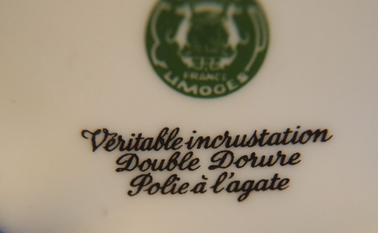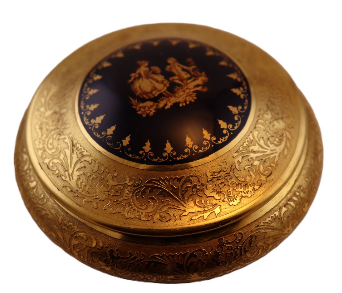 This stunning round Limoges box features a real double 24K gold incrustation and is entirely hand polished with an agate stone, for a spectacular rendering of the gold artwork. In the center is a romantic couple in the traditional Fragonard style, over a cobalt blue background. It belongs to our DECORATIVE collection, and is roughly 1.75 x 3.25 inches in size. This box is unhinged to allow for the gold expanse on the cover to slightly overlap on the gold expanse on the body creating a very elegant fitting.